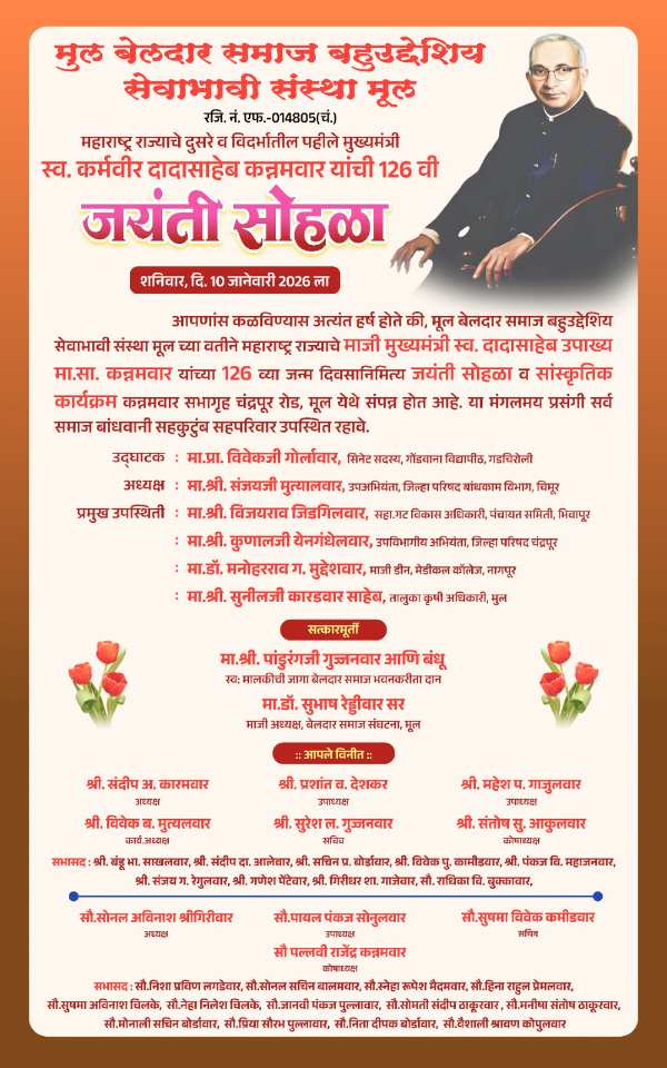 स्व. मा. सा. कन्नमवार यांनी महाराष्ट्राच्या राजकारणात प्रामाणिक, मूल्याधिष्ठित आणि लोकाभिमुख नेतृत्वाचा आदर्श निर्माण केला. त्यांच्या विचारांचा वारसा पुढील पिढीपर्यंत पोहोचावा, या उद्देशाने हा जयंती सोहळा आयोजित करण्यात आल्याचे आयोजकांनी सांगितले. या मंगल प्रसंगी सर्व समाजबांधवांनी कुटुंबासह मोठ्या संख्येने उपस्थित राहावे, असे आवाहन मूल बेलदार समाज बहुउद्देशीय सेवाभावी संस्थेचे अध्यक्ष संदीप कारमवार यांनी केले आहे.